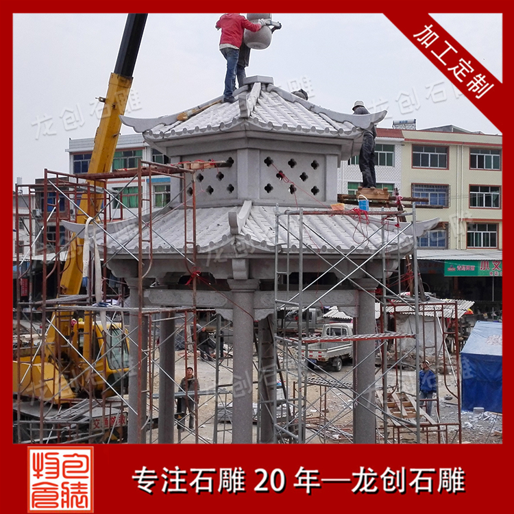 1、安裝石涼亭柱底石墩:在地基平面上分布好位置,安放