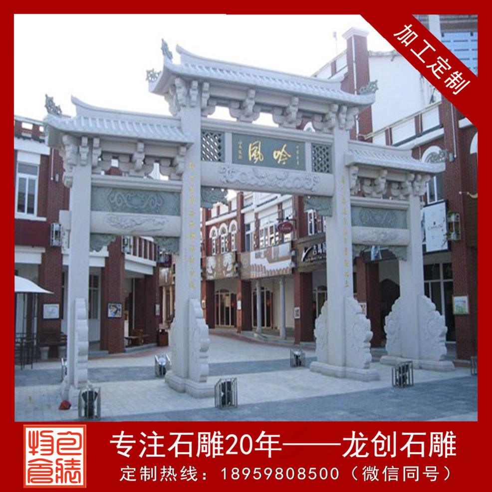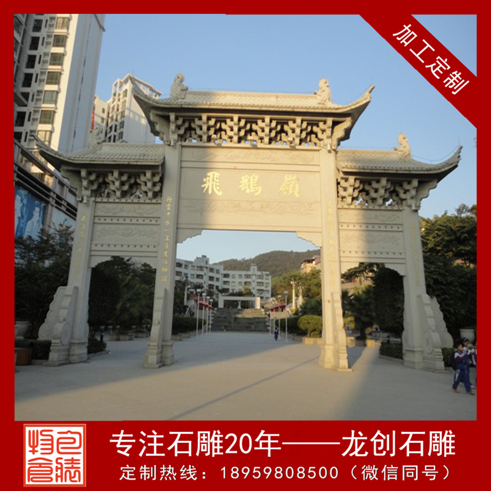 新農(nóng)村石雕牌坊選擇最多的是三門形式,由四根柱子,中間門大一點(diǎn),兩側(cè)是小門,正反兩面花紋一般都是相同的。上面有牌匾,可以雕刻上文字,中間兩根柱子上也可以雕刻對聯(lián)等文字或者其他圖案。