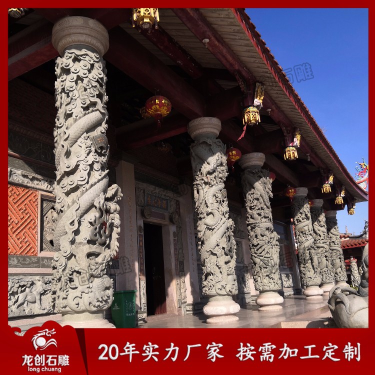 石雕龍柱又叫石雕龍抱柱、盤龍柱、滾龍柱、蟠龍柱,指在石頭上雕刻龍紋的具有指示作用的柱子。龍柱全身雕刻龍紋,一般柱子上下雕刻兩條龍,龍浮雕一般雕刻深度在3-5cm,也有雕刻7-10cm的,深度雕刻的越深龍紋越明顯,龍的神圣形象也就越突出,整個柱子也就越具有莊嚴神圣感。