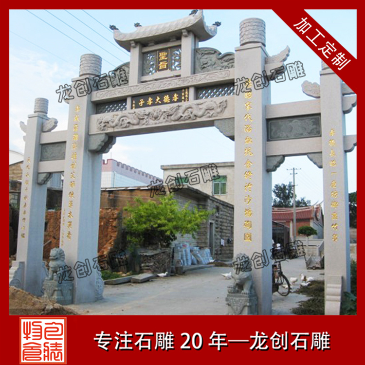 村口石牌坊定制加工浮雕有祥龍、麒麟、吉祥大象等,石獅子位置是石牌坊抱鼓石的位置,在石牌坊主體建筑門前人們不抬頭也可以一眼就看到,不僅很好地映襯和裝飾了進(jìn)村牌坊主體建筑,而且更地塑造了整個(gè)村莊的吉祥文化氣氛。古人生活在一個(gè)易受自然災(zāi)害侵襲和其他不確定因素侵犯的環(huán)境中,需要這種“進(jìn)村石牌坊布局加以保護(hù),進(jìn)村牌坊雕刻具有寧?kù)o、安詳?shù)奶攸c(diǎn)。進(jìn)村牌坊上的守門石獅的設(shè)置正是對(duì)這一特征的強(qiáng)化,是古人追求平靜祥和這一心理特征的側(cè)面反映。